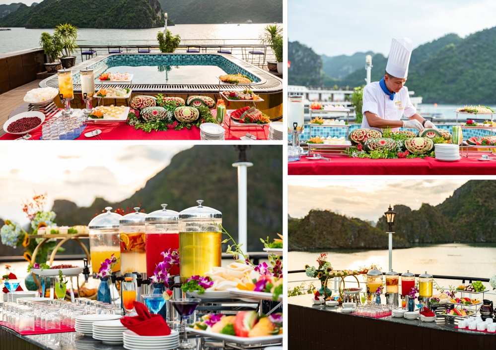 As the sun slowly sets behind the limestone mountains of Bay, the cruise becomes a spectacular natural stage. Guests can relax on the sundeck, enjoy afternoon tea and fresh fruits under the glowing sunset, creating a peaceful and romantic moment in the heart of the heritage site.