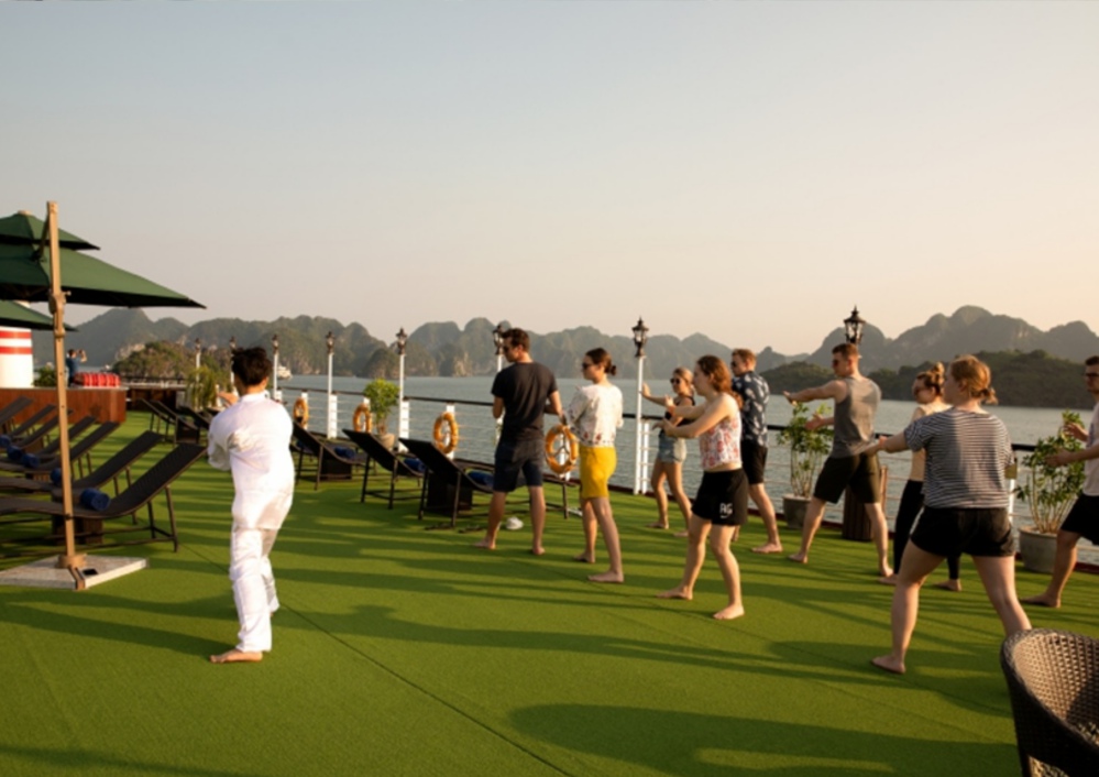 On the sundeck, guests participate in a gentle Tai Chi session, breathing in the fresh air and feeling the balance between nature and body, creating an energizing start to the new day
