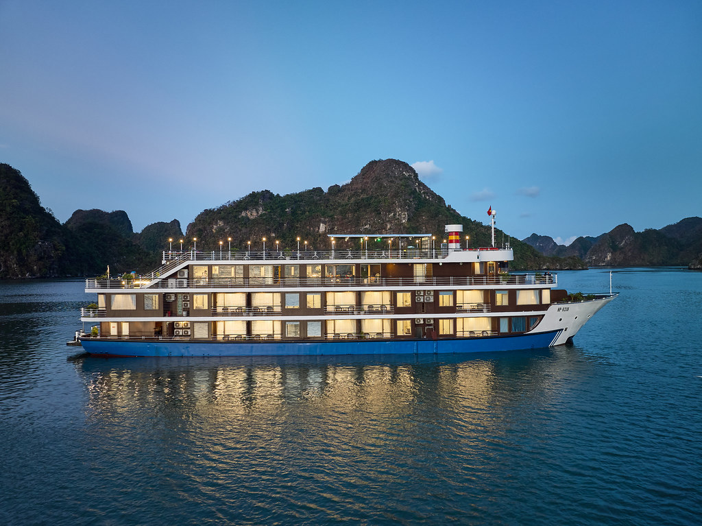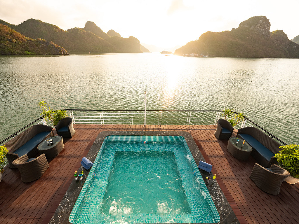 Onboard, guests can indulge in a wide range of amenities, including an outdoor Jacuzzi pool, luxury spa, stylish restaurant and bar, themed parties on request, and limousine transfer services. The journey also offers exciting activities such as kayaking, sunbathing, squid fishing, afternoon tea, and cooking classes – promising unforgettable moments across the magnificent Gulf of Tonkin.
