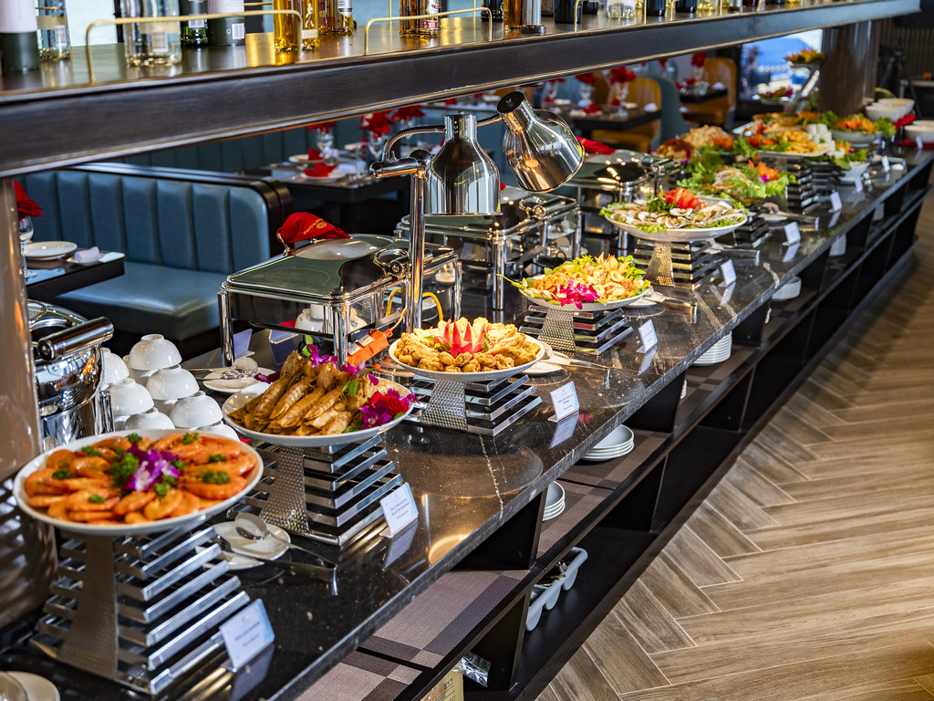 The onboard experience is elevated by a luxurious setting, accommodating up to 99 guests and featuring modern amenities. The premium buffet lunch stands out as a refined highlight, where guests can savor fresh Quang Ninh seafood alongside a rich variety of Vietnamese cuisine, all within an open space surrounded by sea and sky.